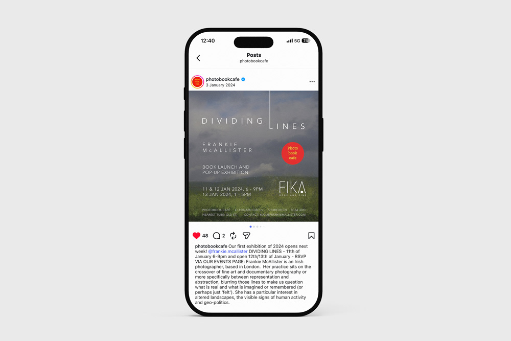 Cover design for Dividing Lines, a post-Brexit photographic essay by Frankie McAllister focused on themes of division and the landscapes of Donegal. The design features an abstract treatment of the title, with a clean vertical line extending upward from the text.